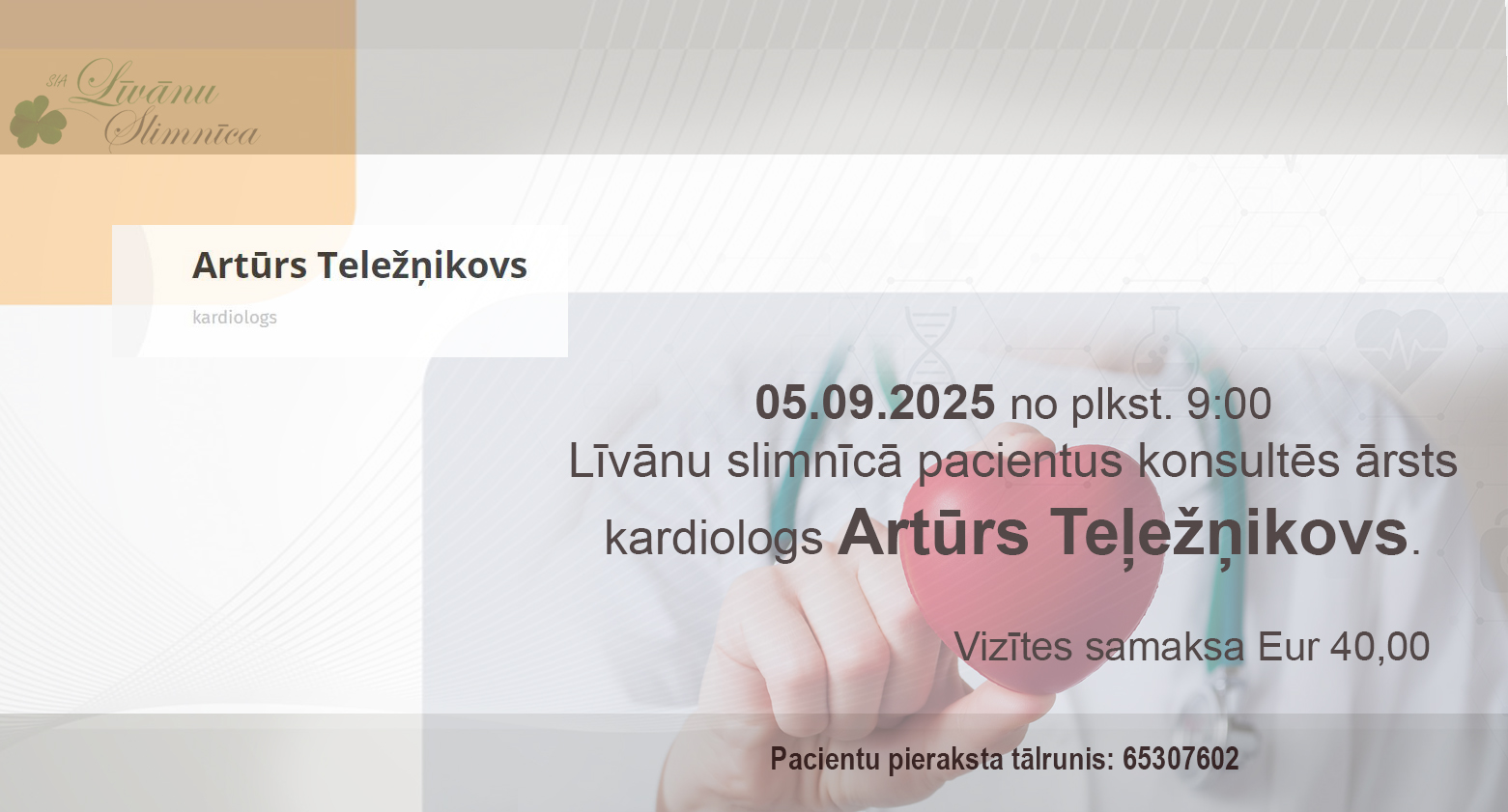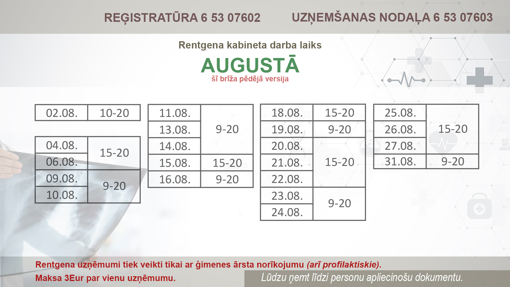 Līvānu slimnīca informē par rentgena kabineta darba laiku 2025. gada augustā: 9., 10., 11., 13., 14., 16., 23., 31. augustā 9.00 – 20.00; 2. augustā 10.00 – 20.00; 4., 6., 15., 18., 20., 21., 22., 25., 26, 27. augustā 15.00-20.00; Obligāti ir nepieciešams ārsta nosūtījums.  Plānotais rentgena datums var mainīties darbinieku slimības, vai citu iemeslu dēļ, tāpēc lūdzu sekot informācijai.…