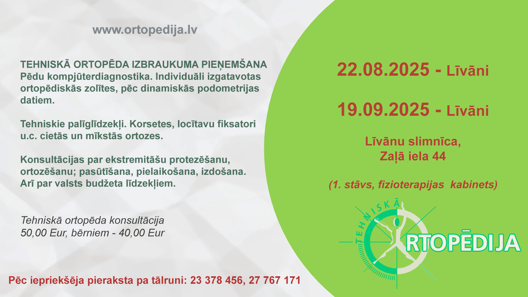 22.08.2025, 19.09.2025, Līvāni Pēdu kompjūterdiagnostika. Individuāli izgatavotas ortopēdiskās zolītes, pēc dinamiskās podometrijas datiem. Tehniskie palīglīdzekļi. Korsetes, locītavu fiksatori u.c. cietās un mīkstās ortozes. Konsultācijas par ekstremitāšu protezēšanu, ortozēšanu; pasūtīšana, pielaikošana, izdošana. Arī par valsts budžeta līdzekļiem. pēc iepriekšēja pieraksta pa tālruni: +371 23 378 456; +371 27 767171…
