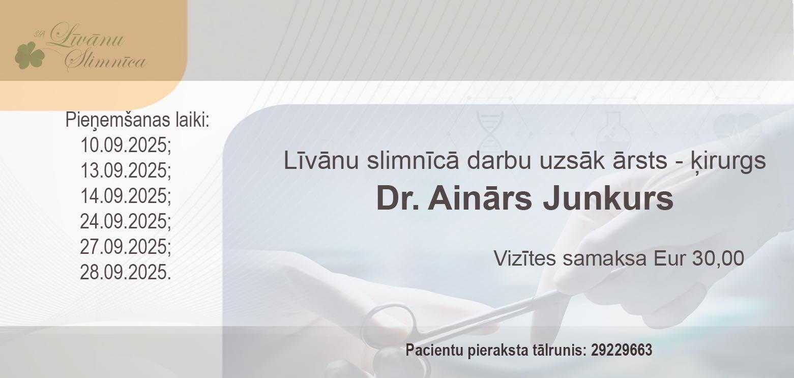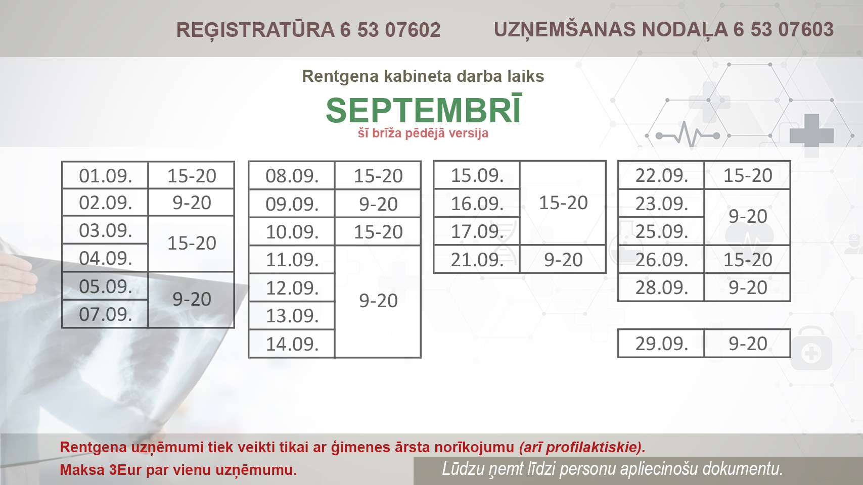 Līvānu slimnīca informē par rentgena kabineta darba laiku 2025. gada septembrī: 2., 5., 7., 9., 11., 12., 13., 14., 21., 23., 25., 28., 29. septembrī 9.00 – 20.00; 1., 3., 4., 8., 10., 15., 16., 17., 22., 26. septembrī 15.00-20.00; Obligāti ir nepieciešams ārsta nosūtījums.  Plānotais rentgena datums var mainīties darbinieku slimības, vai citu iemeslu dēļ, tāpēc lūdzu sekot informācijai.…