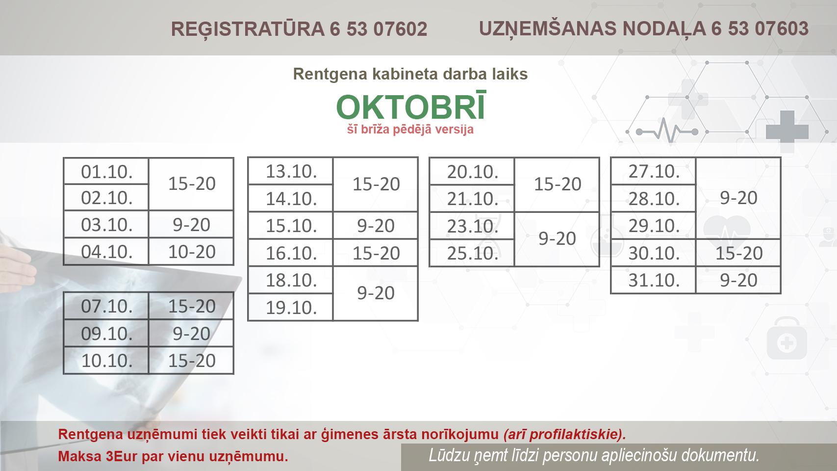 Līvānu slimnīca informē par rentgena kabineta darba laiku 2025. gada oktobrī: 3., 9., 15., 18., 19., 23., 25., 27., 28., 29. oktobrī 9.00 – 20.00; 4. oktobrī 10.00 – 20.00; 1., 2., 7., 10., 13., 14., 16., 20., 21., 30. oktobrī 15.00-20.00; Obligāti ir nepieciešams ārsta nosūtījums. Plānotais rentgena datums var mainīties darbinieku slimības, vai citu iemeslu dēļ, tāpēc lūdzu sekot informācijai.…